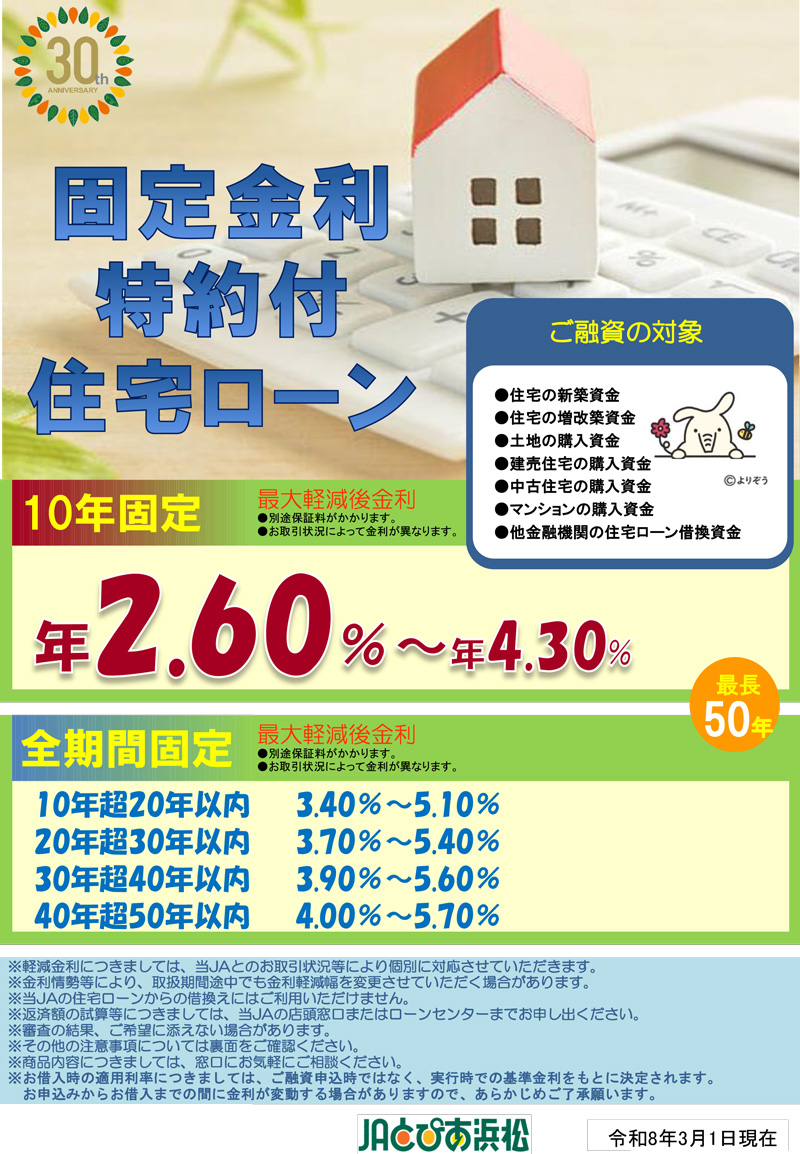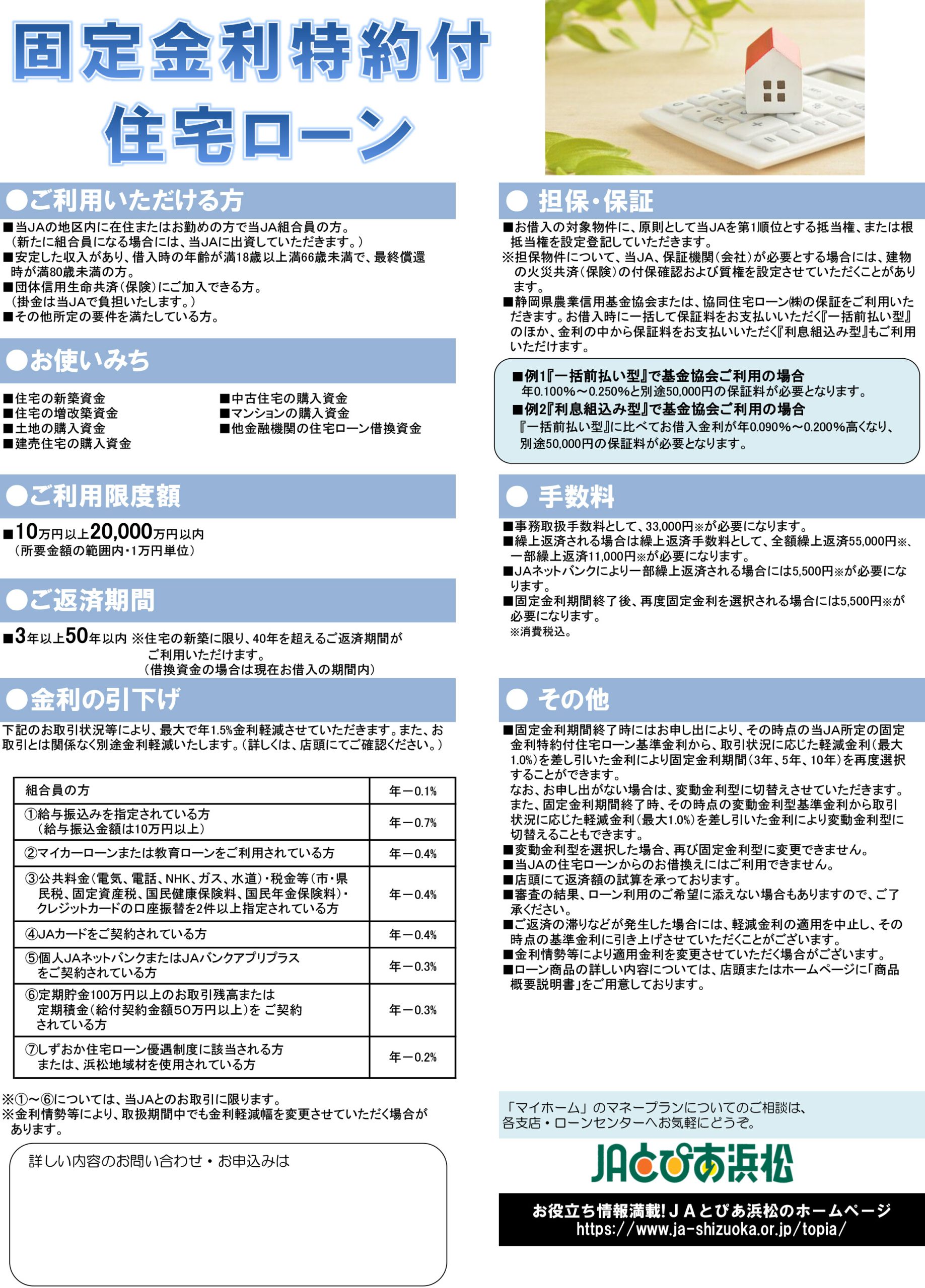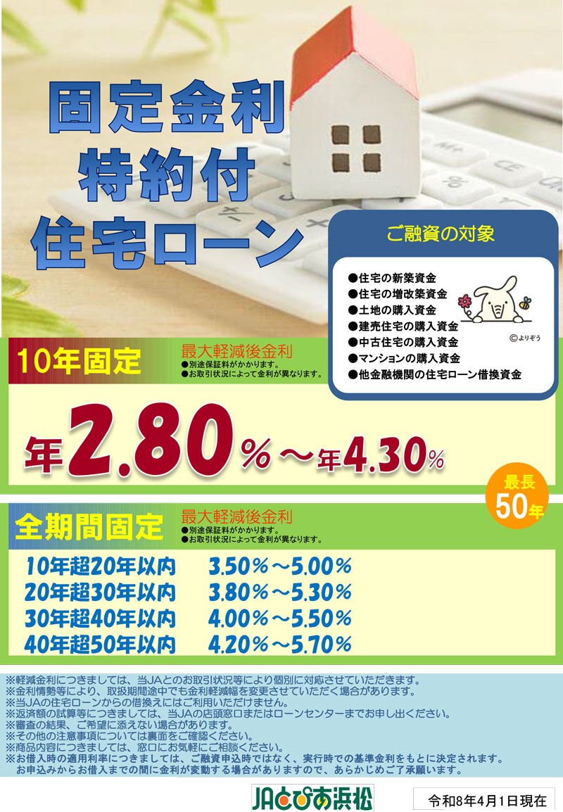 詳しくは、商品概要説明書(固定金利特約付住宅ローン) 商品概要説明書(全期間固定金利特約付住宅ローン)をご覧になるか、窓口へご相談ください。