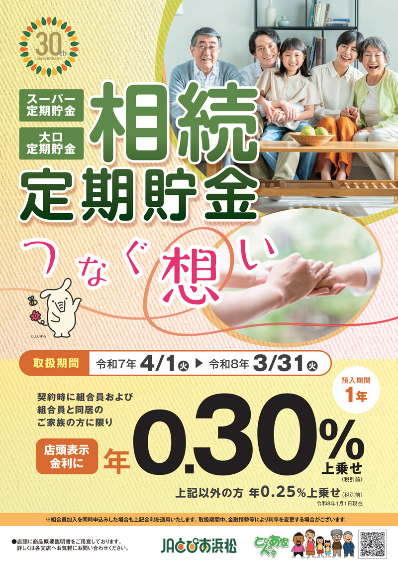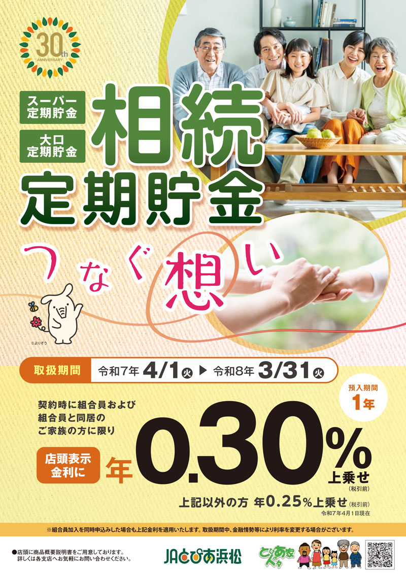 想いを大切に・・・相続により、受け継いだ貯金を大切にお預かりいたします。スーパー定期(単利型)・大口定期貯金の預入期間1年ものに対し、金利を上乗せいたします。